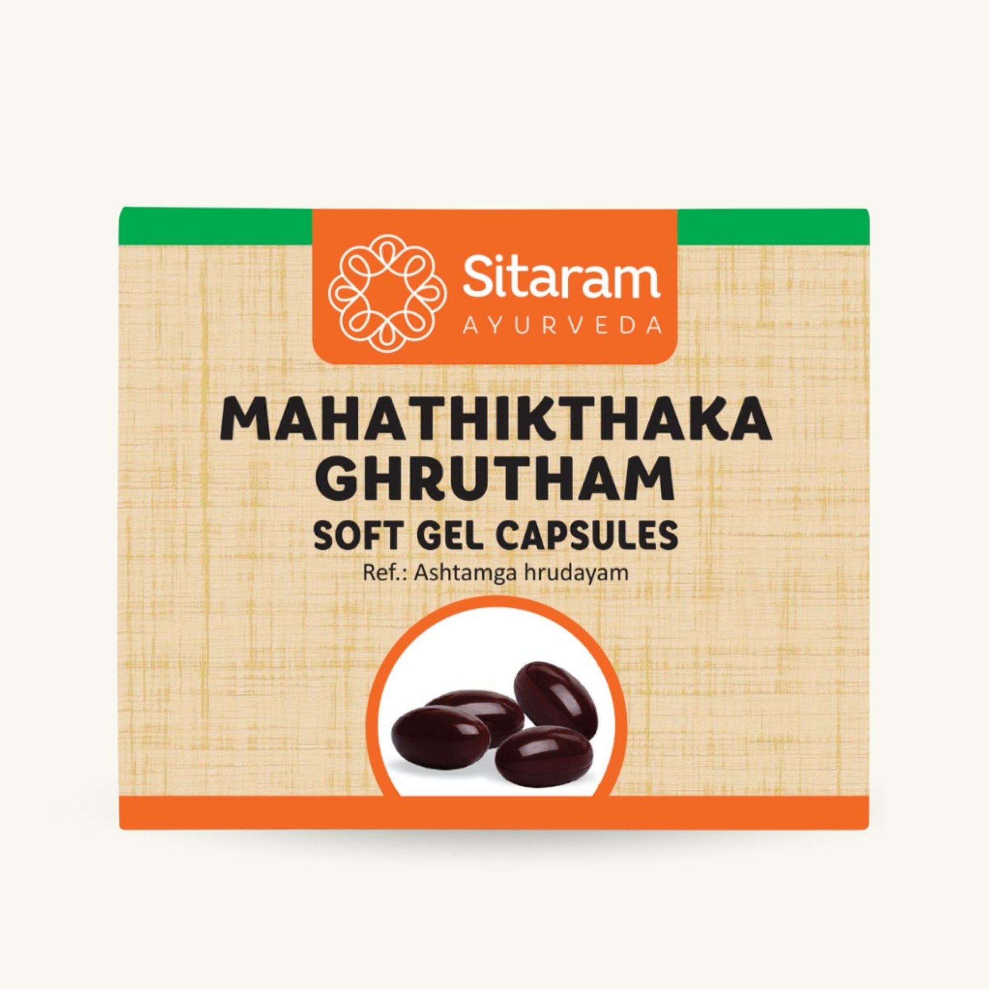 Mahathikthakam Softgel Capsules contain Mahathikthaka Ghrutham, a classical ghee-based Ayurvedic herbal preparation. The traditional formula is cooked in clarified butter with a wide range of bitter and cooling botanicals and then encapsulated in softgel form by Sitaram Ayurveda. This gives a clean, measured and easy way to take the formula internally.