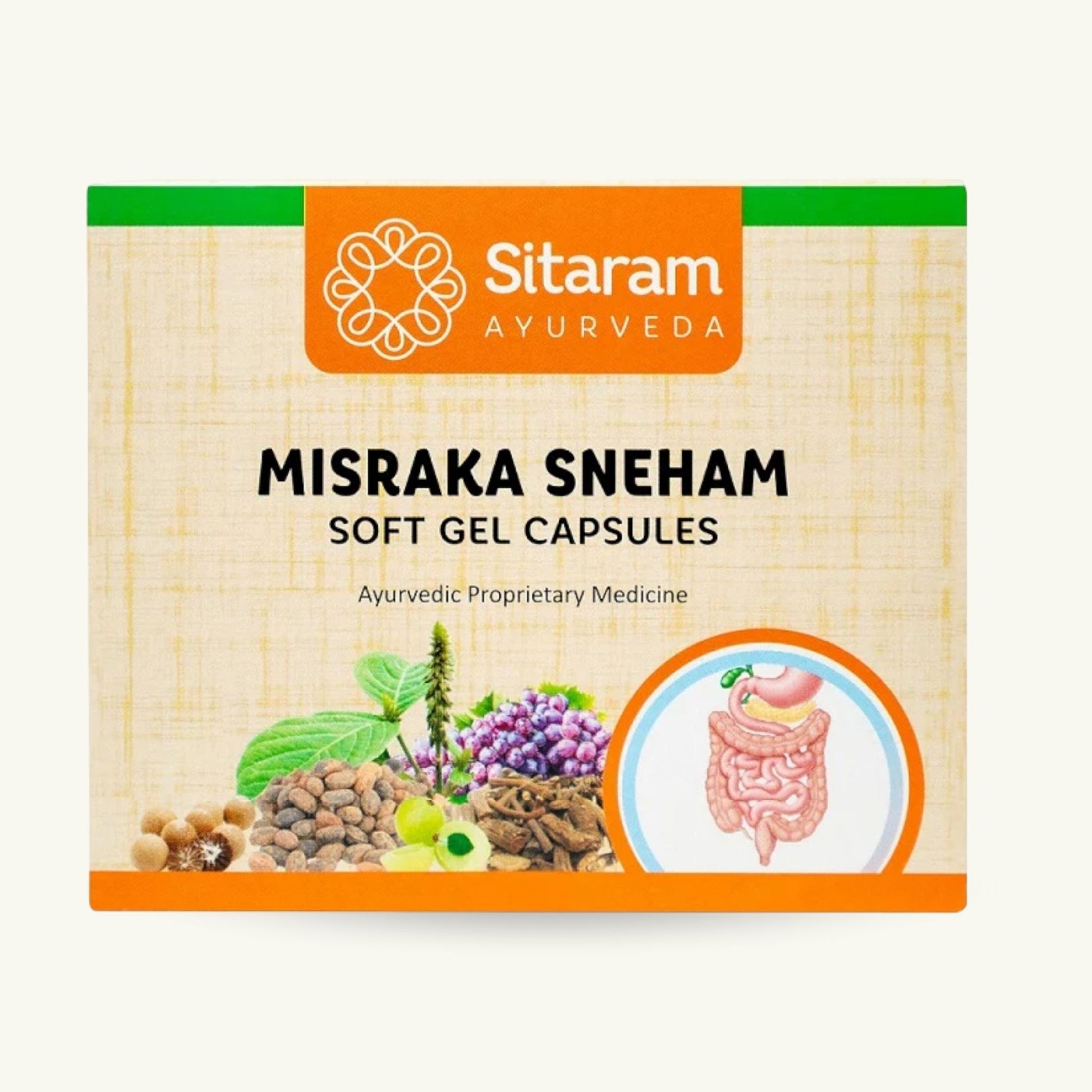 Misrakasneham Softgel contains a classical Ayurvedic herbal oil (Misraka Sneham) encapsulated in easy-to-swallow softgel capsules. The oil is prepared from a combination of traditional botanicals and castor oil using authentic methods by Sitaram Ayurveda.